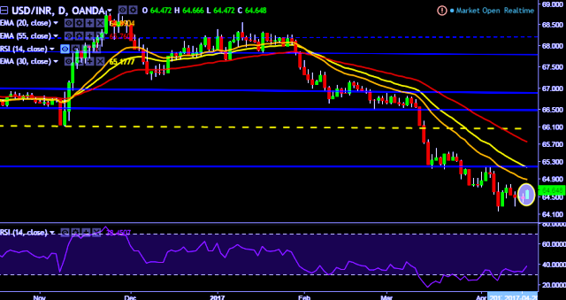 We prefer to go long on USD/INR around 64.58, stop loss 64.36 and target of 64.82.