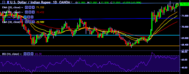 We prefer to take long position on USD/INR around 72.00, stop loss 71.70 and target of 72.23/72.68.