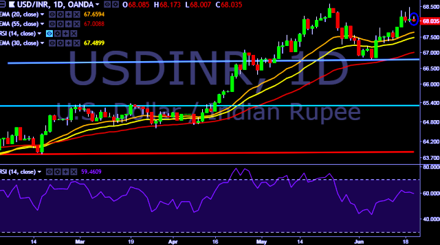 We prefer to take short position in USD/INR only below 67.97, stop loss at 68.20 and target of 67.46.