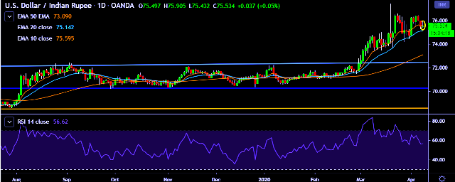 We prefer to take short position on USD/INR only below 75.40, stop loss at 75.98 and target of 74.90/74.50.