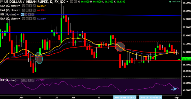 We prefer to take short position in USD/INR around 66.85, stop loss at 67.05 and target of 66.62.