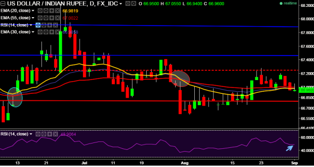 We prefer to take short position in USD/INR around 67.02, stop loss at 67.16 and target of 66.82/66.62.