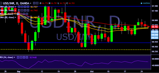 We prefer to take short position in USD/INR around 66.80, stop loss at 66.87 and target of 66.57/66.42.