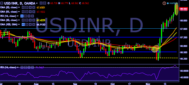 We prefer to take long position in USD/INR around 68.45, stop loss 67.29 and target of 68.85/69.52.