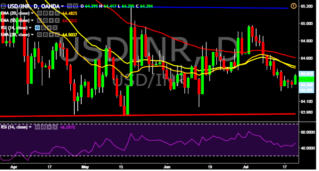 We prefer to take long position in USD/INR only above 64.48, stop loss at 64.25 and target of 64.75.
