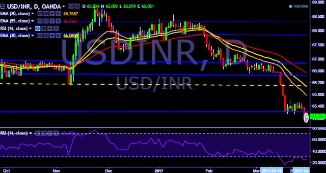 We prefer to take short position in USD/INR only below 65.01, stop loss 65.34 and target of 64.68.