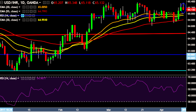 We prefer to take long position in USD/INR around 65.10, stop loss at 64.95 and target of 65.33/65.48.