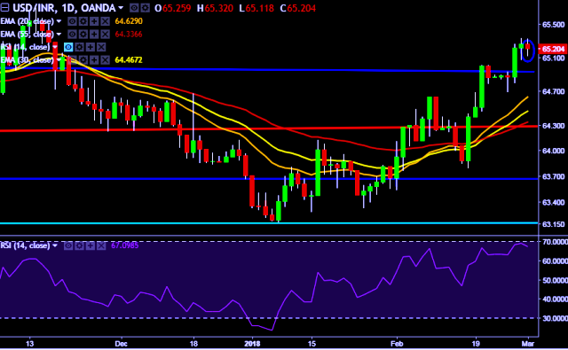 - Key resistances are seen at 65.32, 65.48, 65.65 and 65.82 marks respectively.