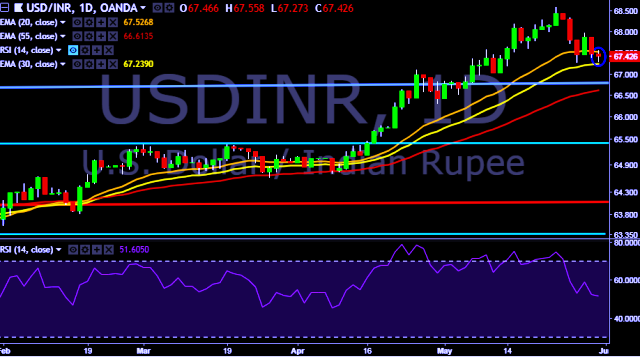We prefer to take long position in USD/INR only above 67.55, stop loss at 67.25 and target of 68.10.