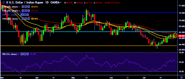 We prefer to take long position on USD/INR only above 69.10, stop loss 68.80 and target of 69.38/69.85.