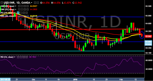 We prefer to take short position in USD/INR around 63.98, stop loss at 64.28 and target of 63.55.