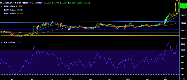 - It made intraday high at 77.41 and low at 74.90 marks.