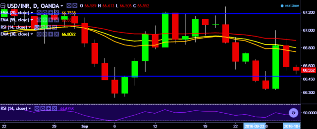 We prefer to take short position in USD/INR only below 66.50, stop loss at 66.90 and target of 66.32/66.24.