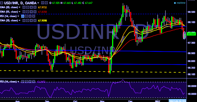 We prefer to take short position on USD/INR around 67.70, stop loss at 67.87 and target of 67.50/67.32.