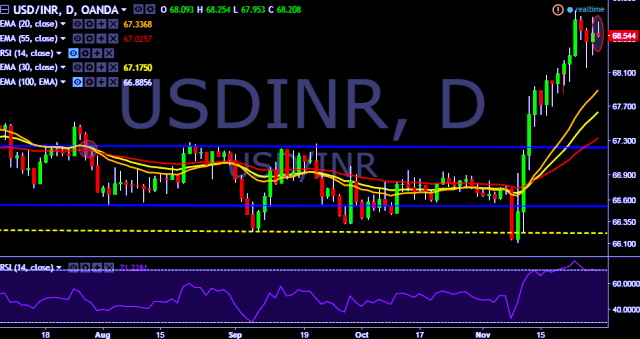 We prefer to take short position in USD/INR around 68.56, stop loss 68.76 and target of 68.30/68.15.