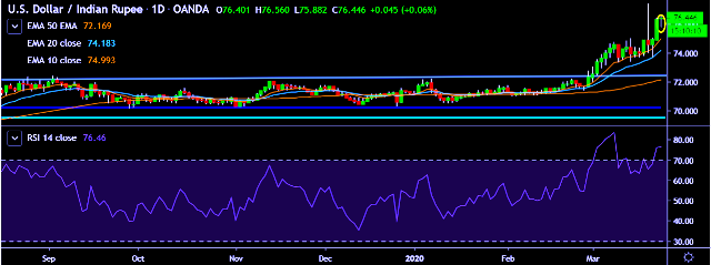 - It made intraday high at 76.60 and low at 75.88 marks.