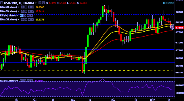 We prefer to take short position in USD/INR around 67.90, stop loss 68.16 and target of 67.67.