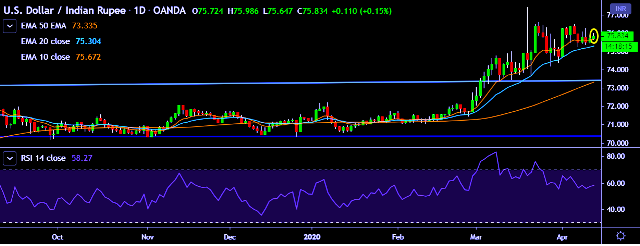 - USD/INR is currently trading around 75.82 marks.