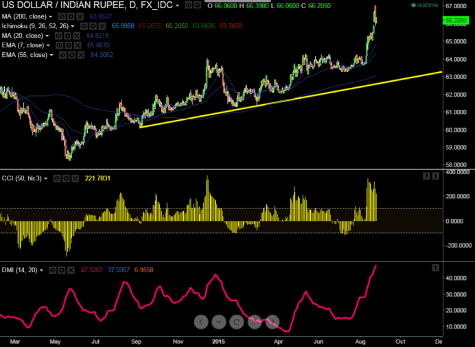 - USD/INR has made a high 67.03 on Monday after blood bath in Indian stock market. Indian benchmark BSE 30-share Sensitive Index (Sensex) recorded its steep intraday crash since 2009 of more than 1700 points.