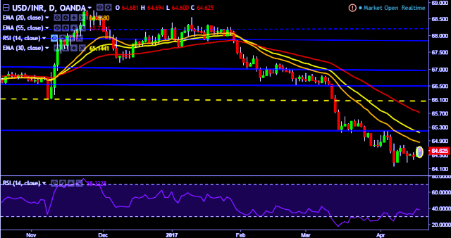 We prefer to go long on USD/INR only above 64.68, stop loss 64.47 and target of 64.82/65.08.