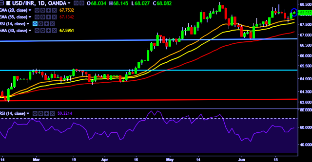 - USD/INR is currently trading around 68.06 marks.