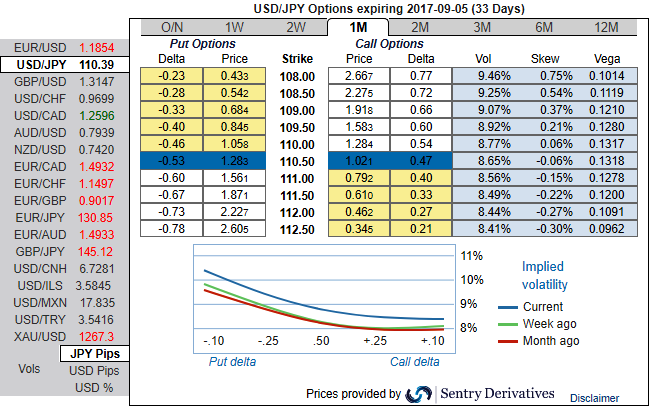 Please be noted that the positively skewed IVs of USDJPY of 1-month tenors signify the hedgers’ interests in OTM put strikes of 108 marks. While delta risk reversals have been flashing up the bearish neutral numbers, thereby, the underlying spot is deemed to be a weaker pair and needs systematic hedging vehicles to arrest this bearish risk.