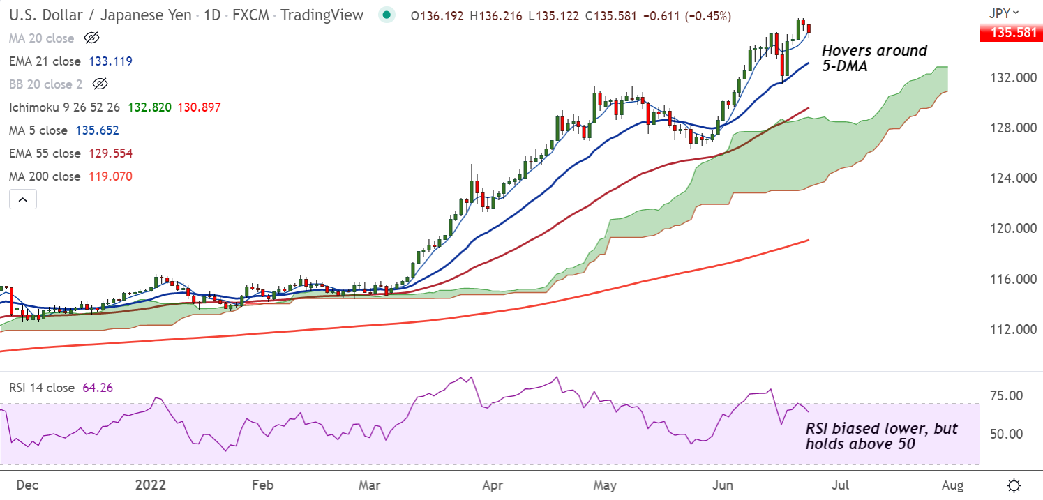 USD/JPY slips lower, extending previous session's losses, breaks below 5-DMA support.