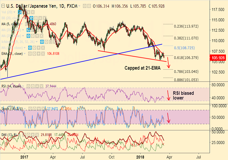 - Price action capped below 21-EMA which is stiff resistance at 106.81