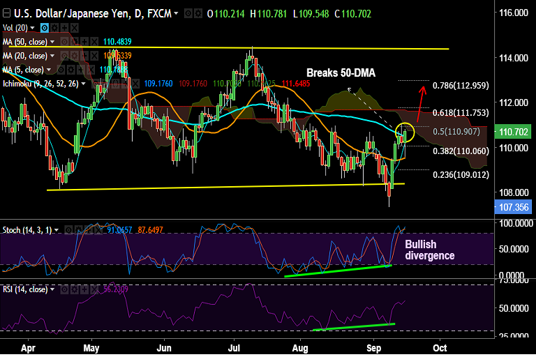 - USD/JPY has retraced dip below 110 handle, breaks above 50-DMA at 110.48.
