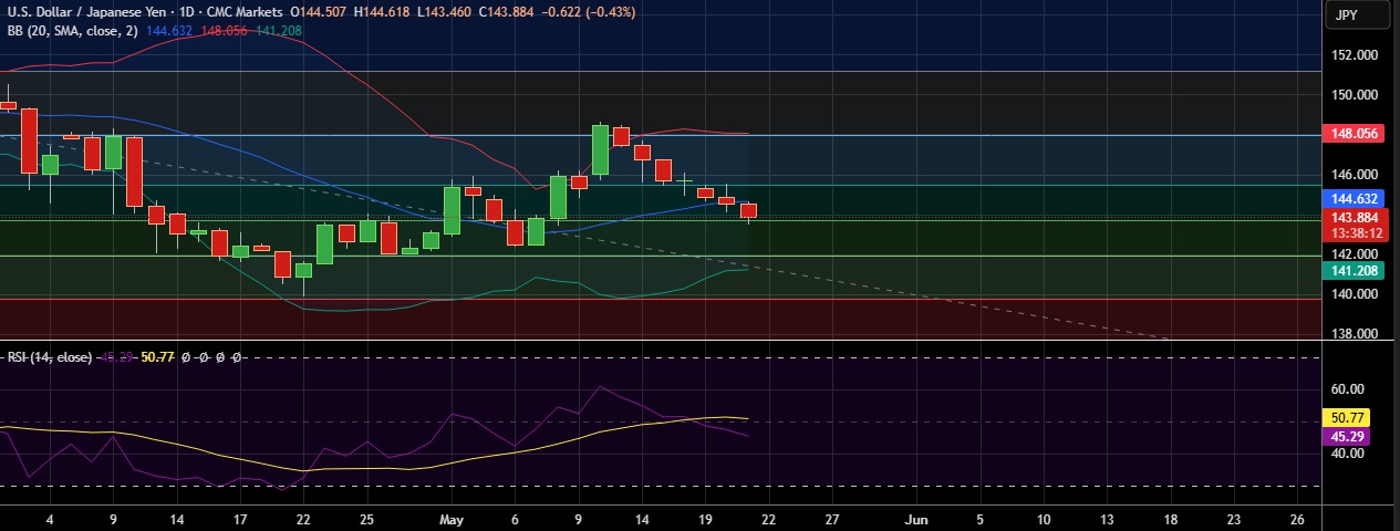 • Support is seen at 143.63(50%fib) and break below could take the pair towards 141.81(38.2%fib).