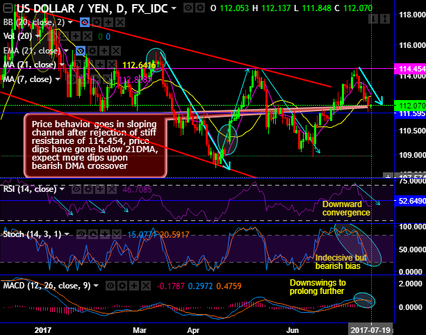 Ever since the rejection of stiff resistance of 114.454 levels, the price behavior again goes in sloping channel, the price dips have again gone below 21DMA, for now, one can expect more dips upon bearish DMA crossover which seems most likely.