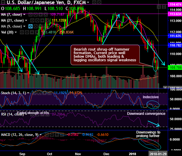 Well, overall, one could trust the indications given by the leading & lagging indicators on daily terms coupled with bearish candlestick formation and bid for further dips upto next strong supports at 107.272 levels.