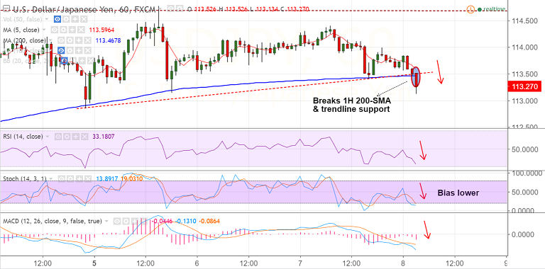 - The pair has broken below 1H 200-SMA and major trendline support at 113.50.