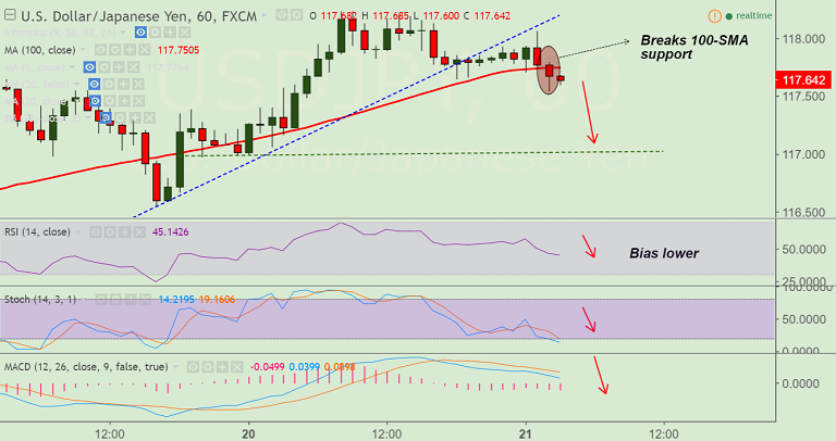 - USD/JPY slips below 5-DMA at 117.72 and has broken 1H 100-SMA support at 117.75.