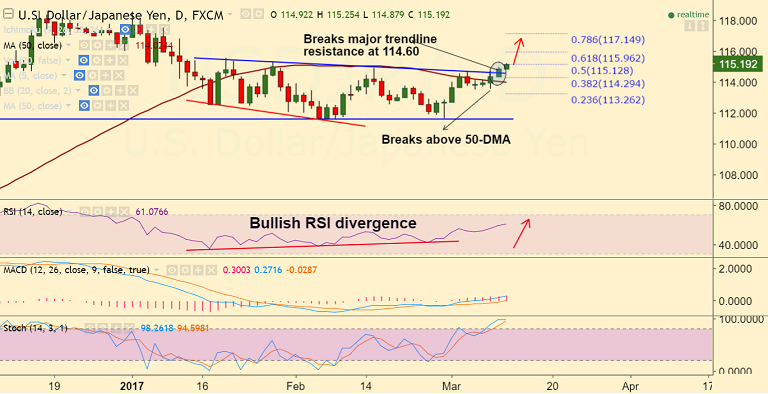 - The pair has broken major trendline resistance at 114.60, is currently hovering around 50% Fib retrace of 118.662 to 111.594 fall.