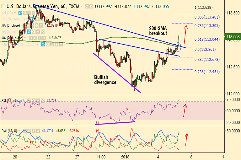- The major has re-claimed 113 handle, bias higher. Technical studies on intraday charts are turning bullish.