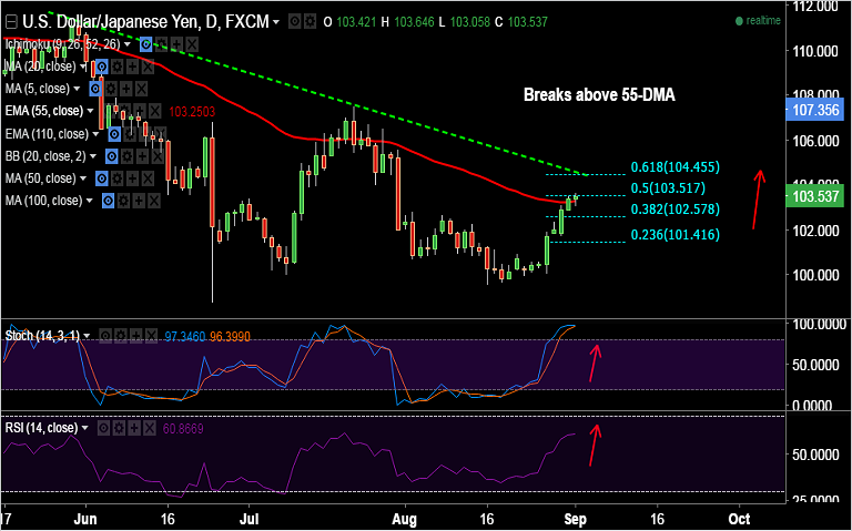 - Major support levels - 103.25 (55-EMA), 103, 102.63 (50-DMA), 102.58 (38.2% Fib).