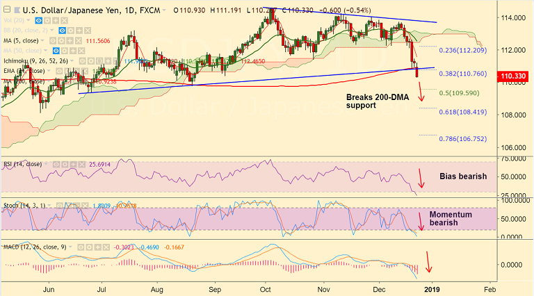 - USD/JPY has slumped below 200-DMA, hits new 4-month lows at 110.26.