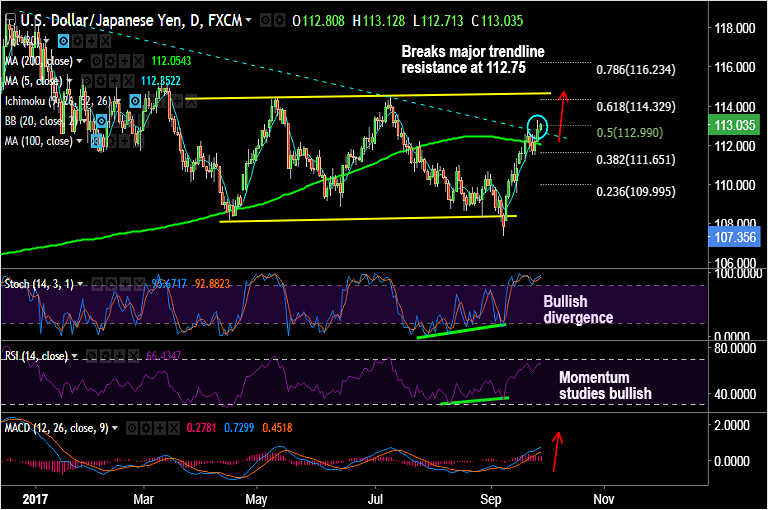 - USD/JPY has broken major trendline resistance at 112.75, bias still higher.