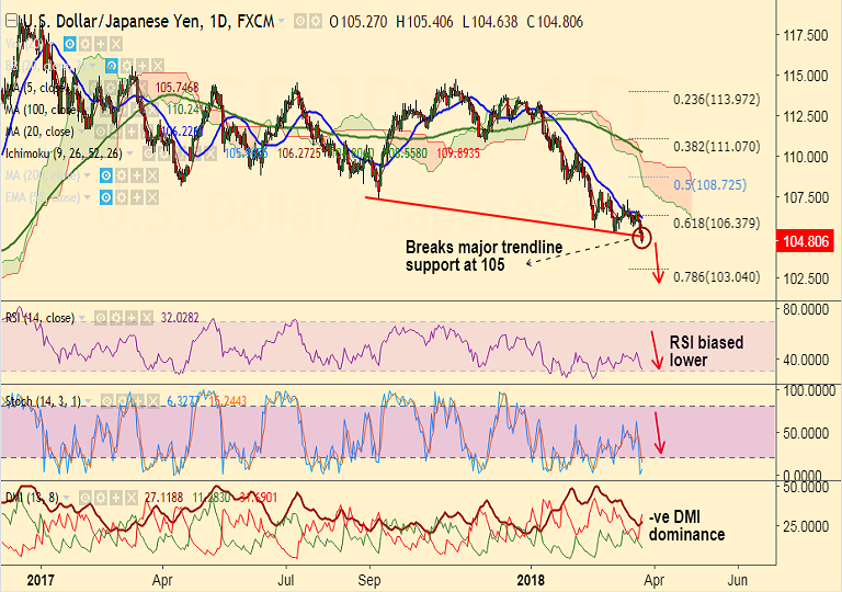 - USD/JPY breaks major trendline support at 105, hits new 14-month lows at 104.63.
