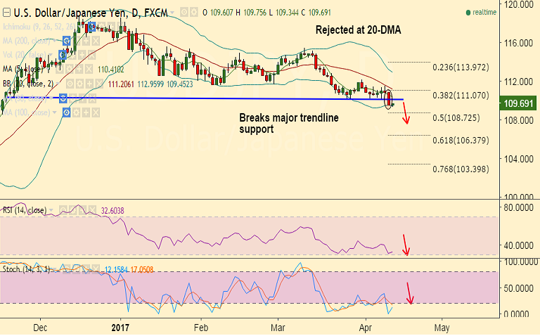 - The pair has broken major trendline support at 110.10 and we see scope for test of 200-DMA at 108.54.