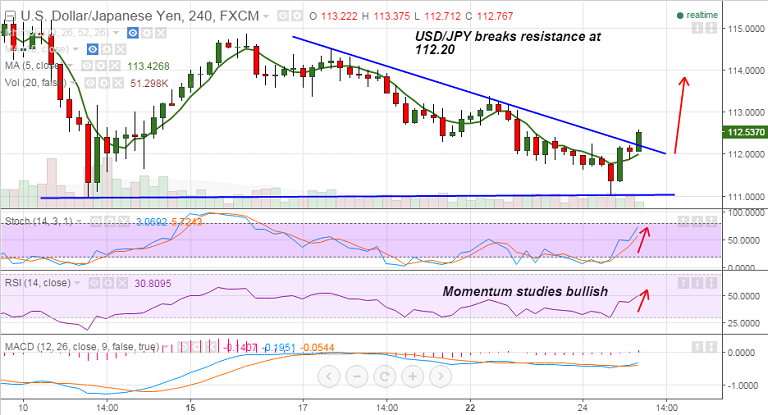 USD/JPY catches fresh bid tone in the last hour, breaks trendline resistance at 112.20.