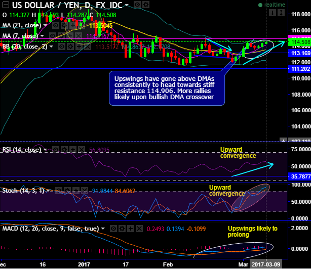 These upswings have gone above DMAs consistently to head towards stiff resistance 114.906. More rallies likely upon bullish DMA crossover.