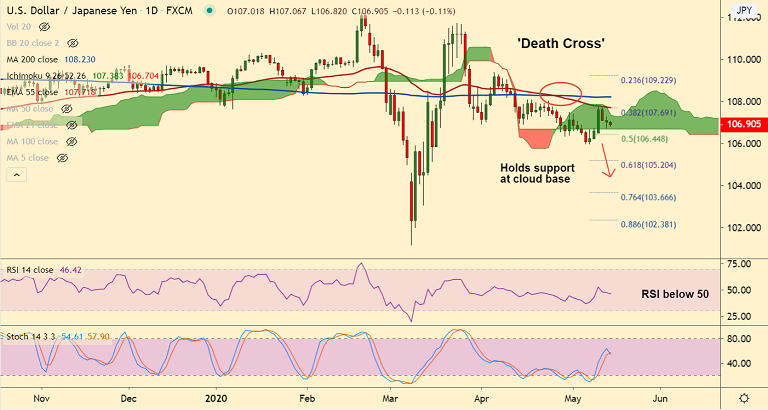USD/JPY poised for further downside. Recovery remains capped at 21-EMA. Price action finds strong support at cloud base. Break below will see further downside.