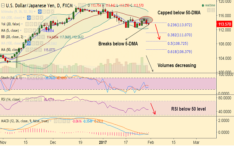 - USD/JPY remains capped below 50-DMA, has broken 5-DMA on Monday, bias lower.