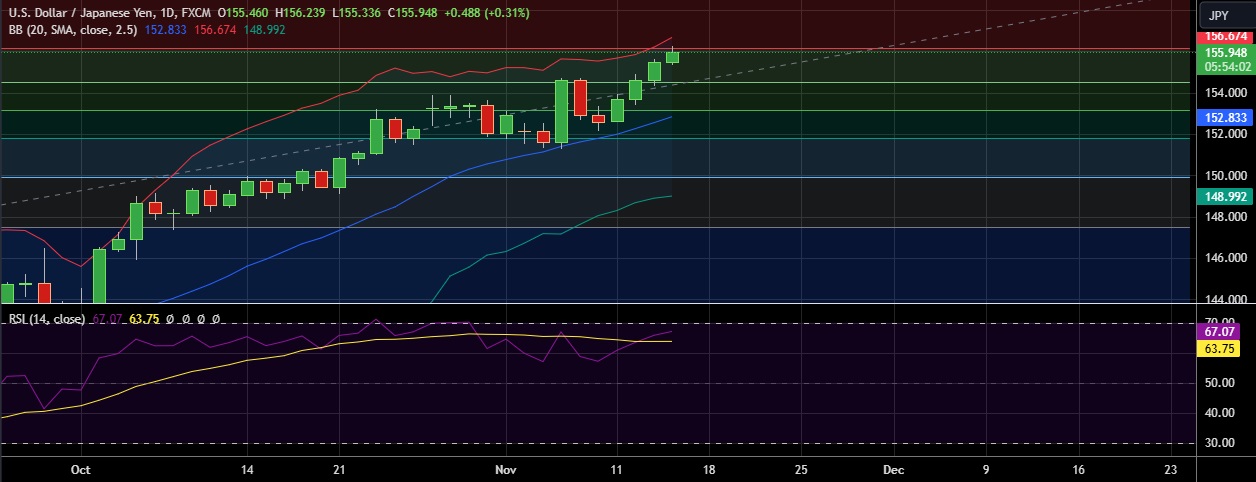 • Immediate resistance is located at 156.16 (23.6%fib), any close above will push the pair towards 156.64(Higher BB).