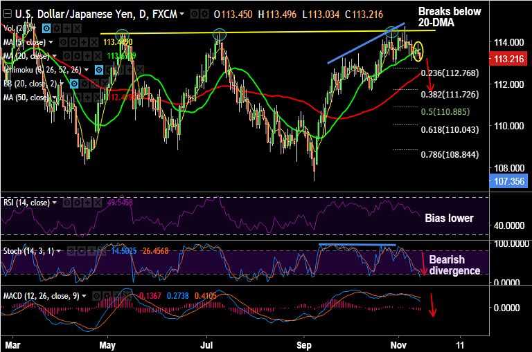 - Bearish divergence of RSI and Stochs from price action keeps scope for downside. 50-DMA at 112.48 in sight.