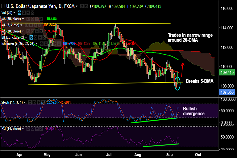- USD/JPY spiked past 5-DMA and closed shy of stiff resistance at 20-DMA at 109.43 on Monday's trade.