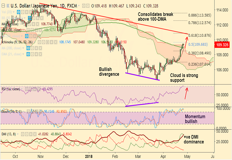- The pair has broken above 100-DMA and edged above daily cloud which now offers strong support at 109.21 (cloud top).