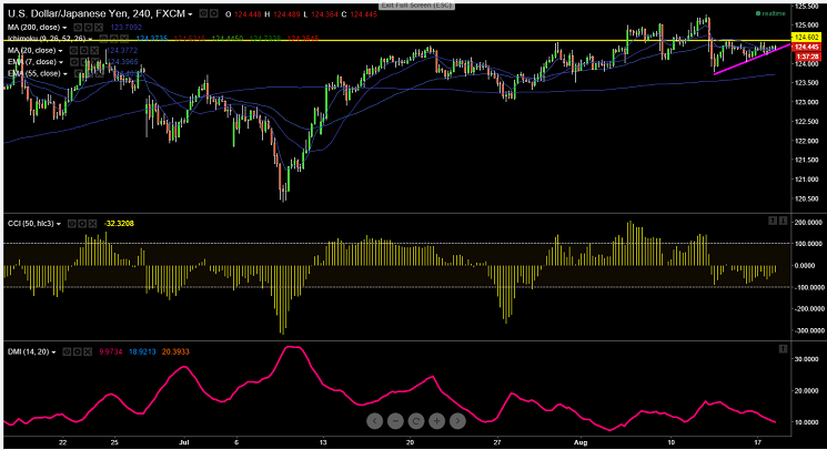 - USD/JPY has consolidated between between 124.56-124.21 yesterday.It is currently trading at 124.42. Overall trend is bullish as long as support 123.50 holds.